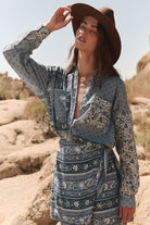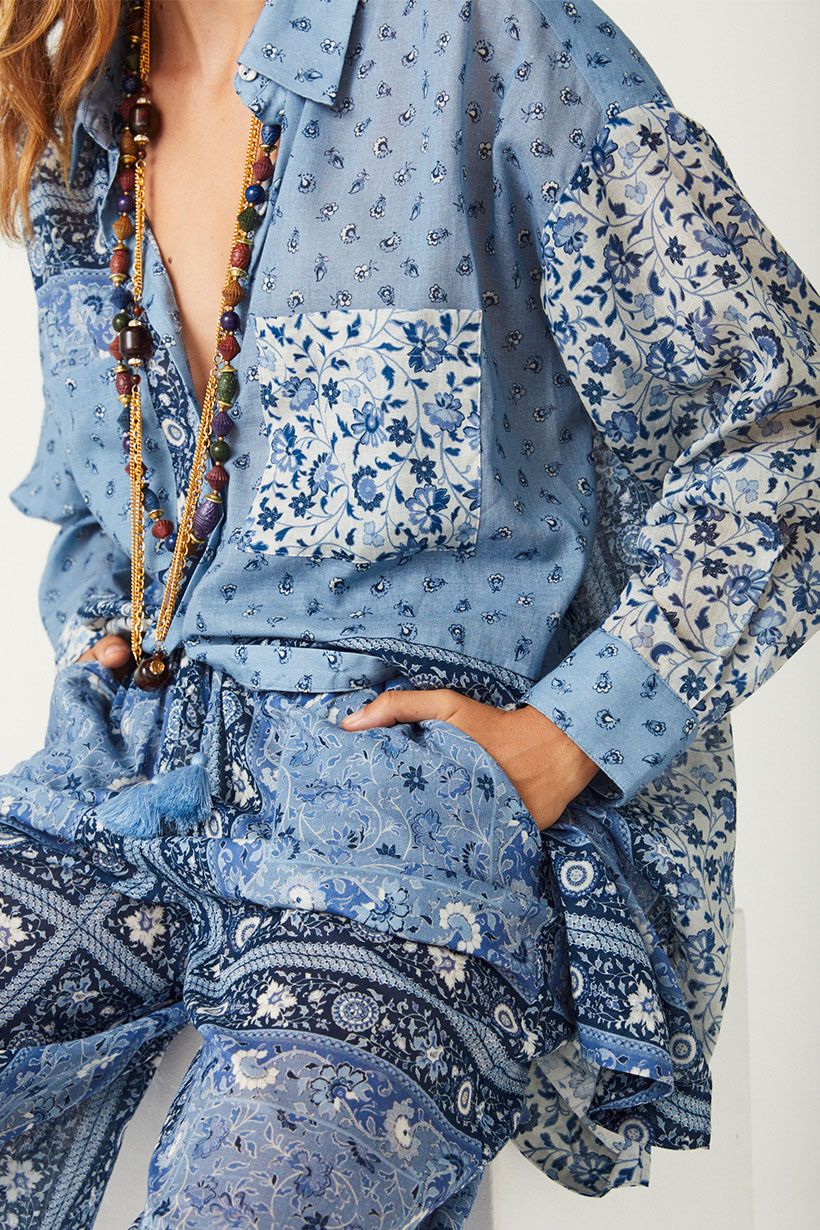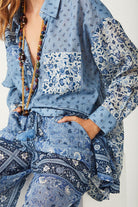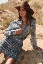 Step out with confidence in our statement Sunshine Bandit Shirt Dress in Chambray. This short dress marries western inspiration with modern intrigue, featuring patchwork floral, ditsy and border placement. Our shirt dress features front pockets, a flattering curved hem and a button down front that can be worn open as a cover up for styling versatility. We love that this can be worn as a dress with boots or as a shirt paired with our Sunshine Bandit Wide Leg Pants for a chic off duty look.