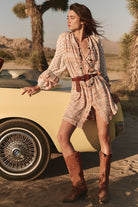 Move through life with insouciant grace in the Sunshine Bandit Tunic Dress in Desert Sage. This piece features a mesmerising mix of dusty hues and a patchwork of hand-painted floral, ditsy print and striking border placement. The relaxed silhouette, breezy hemline and billowing sleeve offers a free spirited ambiance and ensures both comfort and style. This one includes a detachable waist tie and button down front for styling versatility allowing this one to be plucked for wear in any season. Pair with cowboy boots and a vest for festival styling or with tan mules and fine jewels for a relaxed evening look.