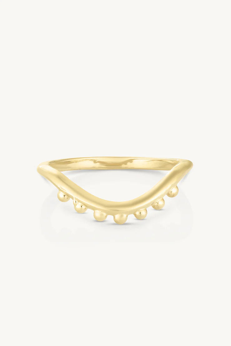 The Noble Crescent Stacking Ring features a crown of delicate ball details across the band. Designed to stack seamlessly with your other treasures, it adds a regal touch to any look.