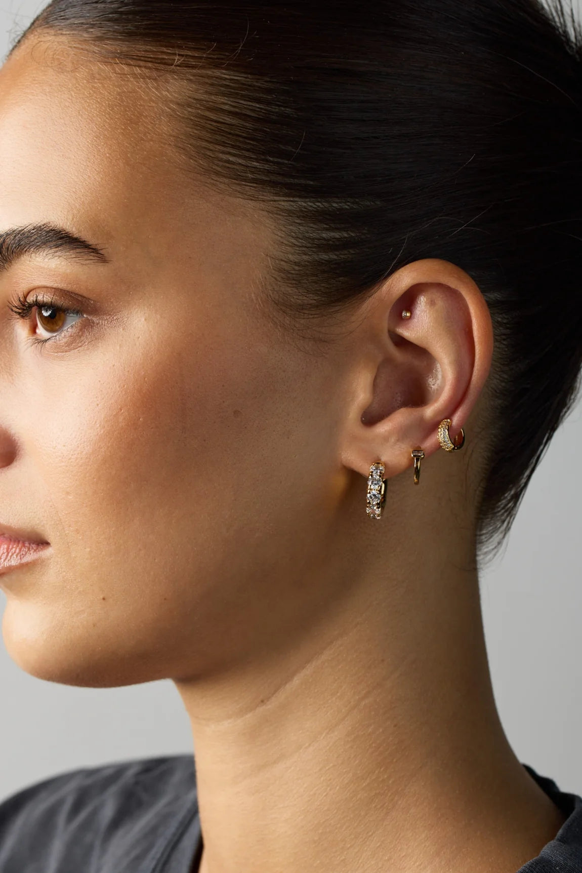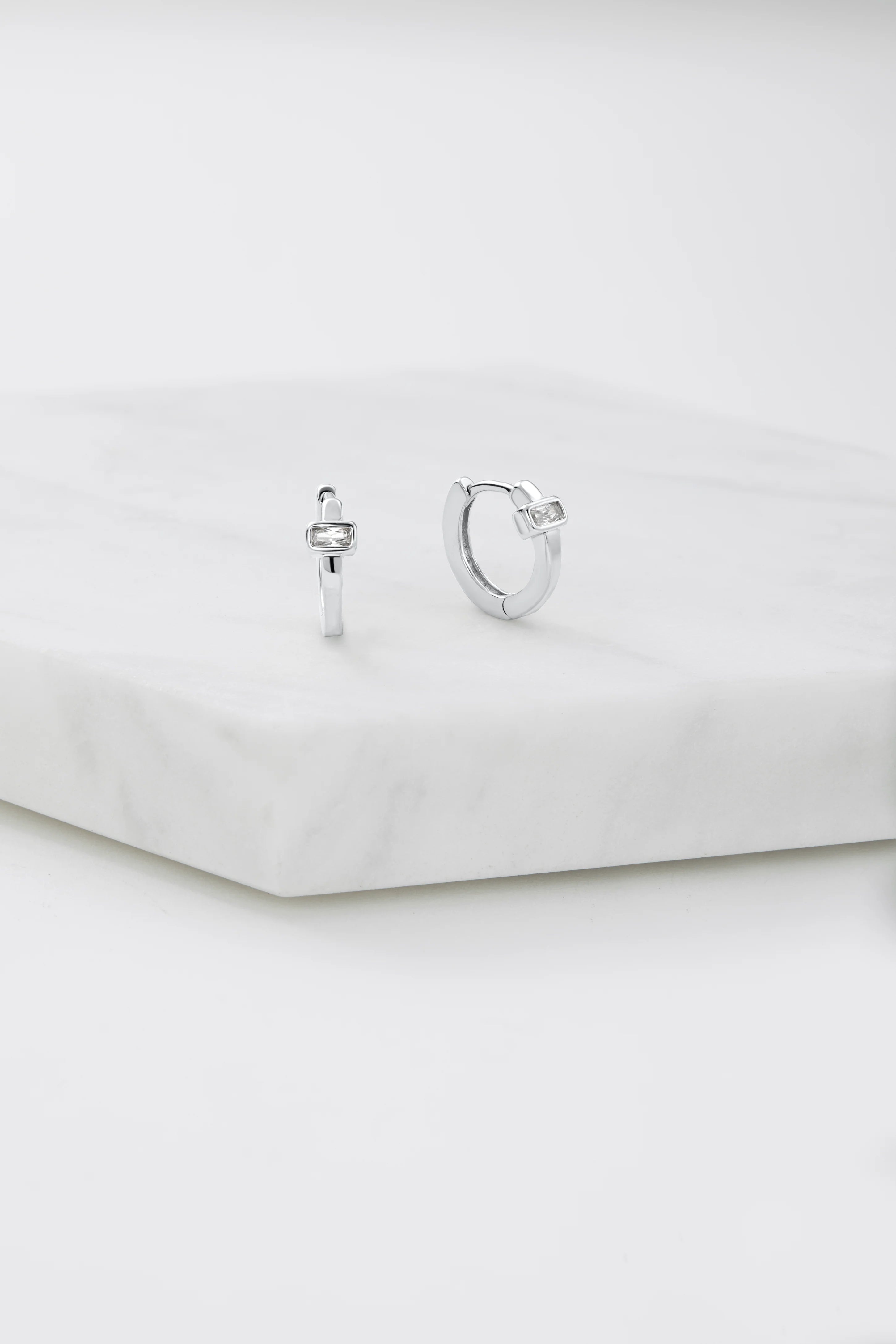 The Elsie Huggie is a petite and elegant hoop, featuring a stunning baguette-cut crystal at its center for a refined sparkle. Designed for effortless everyday wear, this delicate huggie is perfect for stacking or wearing solo as a subtle statement.